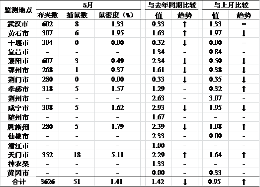 表5 2016年5月湖北省各市(州)病媒生物监测结果—鼠密度