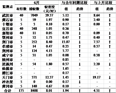 本月蚊密度监测结果显示,武汉市最高为(29.37只/灯·时),其次是天门市。本月各市(州)蚊密度监测结果比较情况见表6。
