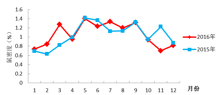 在城镇居民区、特殊行业和农村自然村等不同环境类型设点开展鼠密度监测,从2016年的季节消长趋势看,捕获鼠密度在3-9月份密度较高,整体上与2015年的鼠密度保持正常波动(如图1所示)。