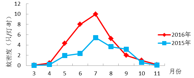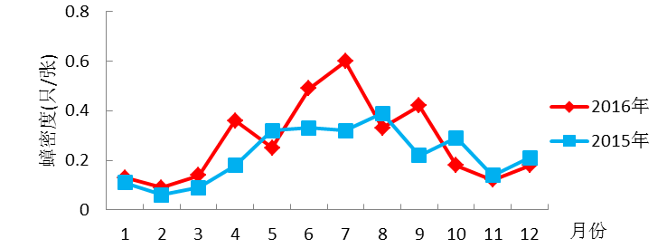 在城镇居民区、公园、医院、农户和牲畜棚等不同环境类型开展蚊密度监测,从全年的季节消长趋势看,捕获的蚊类密度呈单峰分布,从3月份不断升高,到7月达到高峰,随后逐渐下降。2016年的蚊密度整体上略高于2015年,尤其是在6月、7月的蚊密度升高较为明显(如图2所示)。