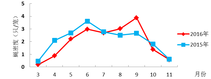 在农贸市场、餐饮外环境、绿化带、城镇居民区等不同环境类型开展蝇密度监测,从全年的季节消长趋势看,我省蝇类密度以9月份最高达3.88只/笼,之后逐渐下降。与2015年相比较,2016年我省蝇密度高峰出现的时间略晚,但随后即迅速下降(如图3所示)。