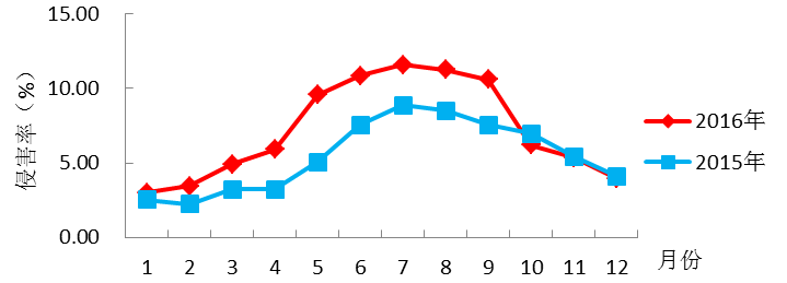 图5 全省2016年和2015年蟑平均侵害率季节消长趋势