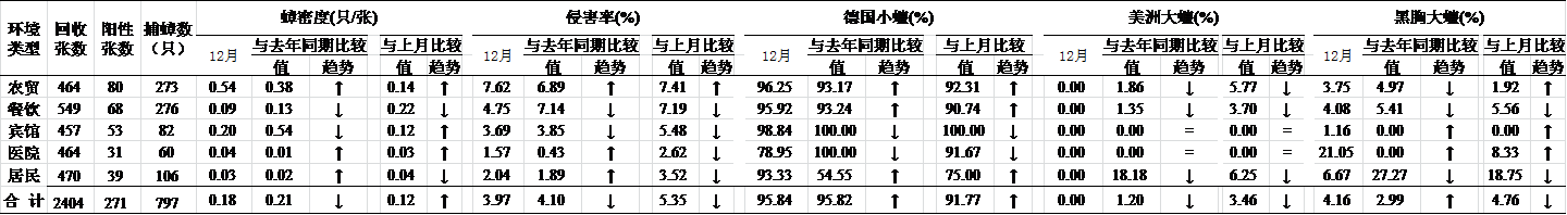 本月病媒生物监测结果显示,全省鼠平均密度为0.82%,与上月相比略有升高,但与去年同期相比有所下降;所捕获鼠以褐家鼠为主。全省蟑平均密度为0.18只/张,与上月及去年同期相比均略有升高;平均侵害率3.97%,与上月及去年同期相比均有所下降;所捕获蟑以德国小蠊为主。