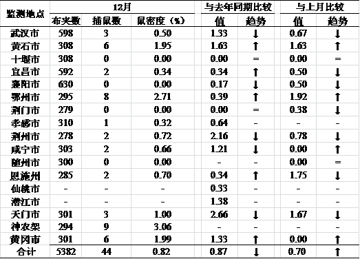 表3 2016年12月湖北省各市(州)病媒生物监测结果—鼠密度