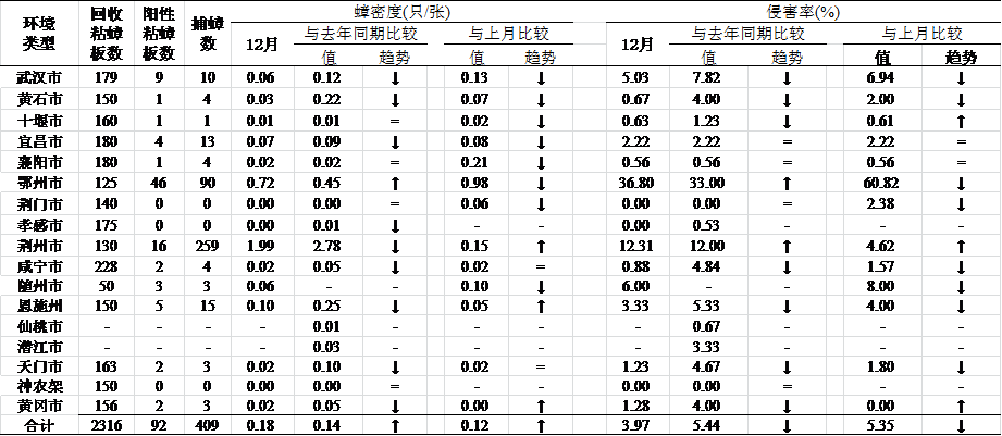 本月蟑密度监测结果显示,荆州市最高(1.99只/张),其次是鄂州市;侵害率监测中,鄂州市最高36.8%,其次是荆州市。本月与去年同期及上月各市(州)蟑密度和蟑侵害率监测结果比较情况见表4。