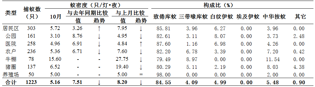 本月病媒生物监测结果显示,10月全省平均蚊密度为5.16只/灯·夜,较去年同期(7.51只/灯·夜)和上月(8.20只/灯·夜)均有所下降,捕获蚊以致倦库蚊为主;登革热媒介伊蚊监测显示部分地区布雷图指数超过了安全值5。全省平均蝇密度为3.30只/笼,较去年同期(2.74只/笼)有所上升,较上月(4.62只/笼)有所下降,捕获蝇以家蝇为主。。