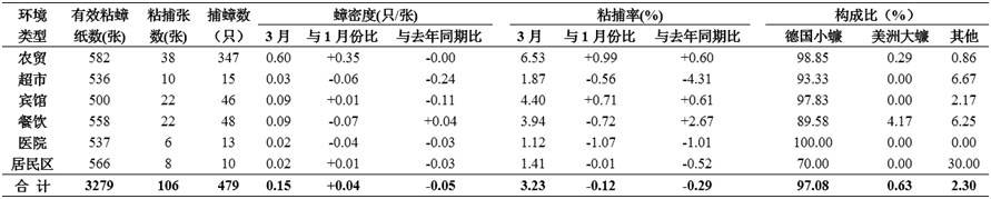 表2 2019年3月不同监测环境的蟑密度、蟑粘捕率及种群构成情况比较