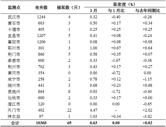表3 2019年3月湖北省各市(州)病媒生物监测结果—鼠密度