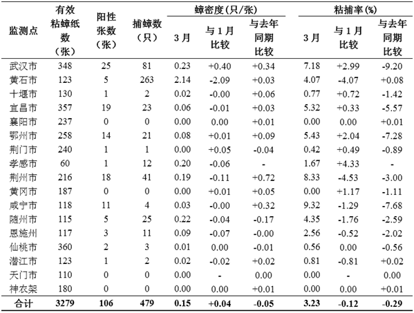 按照《湖北省病媒生物监测方案(2017版)》要求, 2019年3月应开展鼠和蟑密度监测,现将全省各市(州)开展病媒生物监测情况汇报如下: