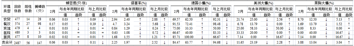 2、蟑密度及侵害率2487张,阳性56张,共粘捕蟑147只,全省平均蟑密度为0.06只/张,侵害率2.25%,其中,在本月不同监测点中,餐饮的蟑密度较高,其次是农贸市场、城镇居民区、宾馆和医院。与去年同期及上月相比,蟑密度和蟑侵害率均有所下降。捕获蟑以德国小蠊为主。全省不同监测环境蟑密度、侵害率及其种群构成情况的比较结果详见表2。